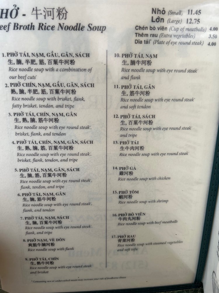 Combination pho (rare eye of round, flank, fatty brisket, tendon, tripe).